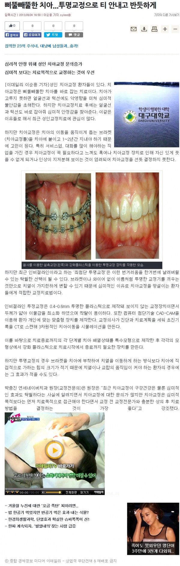 [이데일리]삐뚤빼뚤한 치아...투명교정으로 티 안내고 반듯하게